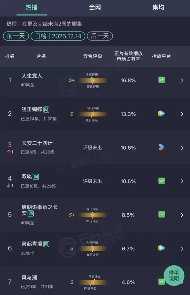 截止稿前,《大生意人》已连续12天稳坐(12.03-12.14)云合霸屏榜日榜冠军宝座,最高市占率21.5%,是爱优腾芒12月上新剧中目前唯一一部获得云合S+评级的剧集,同时其CVB收视直至收官稳稳保持在2.14%到2.34%的高位区间,豆瓣口碑也仍维持在7分线上。