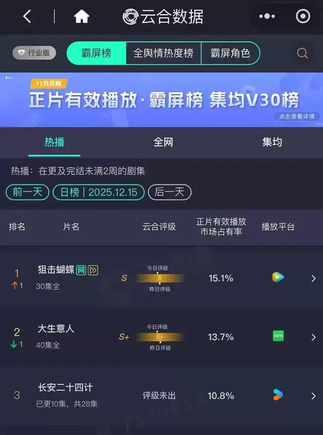 这部小成本的A级剧,从12月4日开播后就引发了网友极大的追剧热情,直到12月15日VIP大结局,这十几天时间内,除了《长安二十四计》和《双轨》首播冲了一下网剧热度榜一外,其他日子里《狙击蝴蝶》的热度一直维持在网剧第一位。