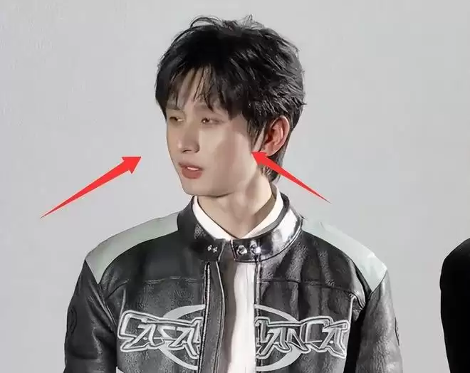 当天他使用了较厚重的粉底,但因皮肤出油严重,额头和T区泛起明显油光,在强光照射下显得格外黏腻,连眼角细纹也被高光衬托得更为深刻。