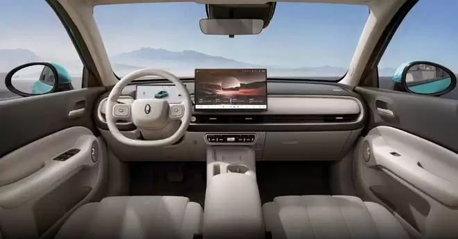 走进车内,欧拉 5 内饰采用极简化设计语言,以「悬浮式双屏」为核心构建了整个座舱。采用 15.6 英寸中控屏与 10.25 英寸全液晶仪表组合,搭配双辐式多功能方向盘及电子怀挡,营造出清爽、现代的视觉体验。中控屏下方保留一排实体物理按键,兼顾操作便捷性与功能可靠性。