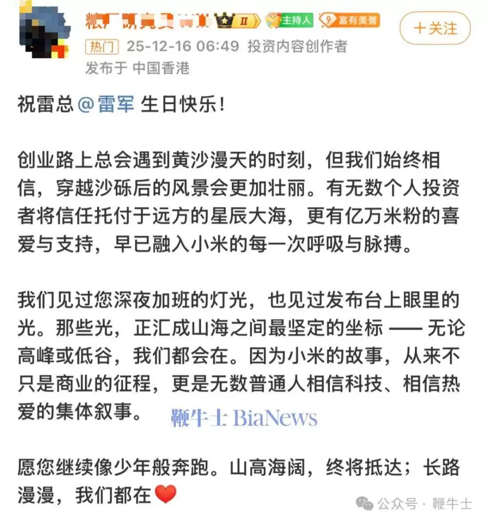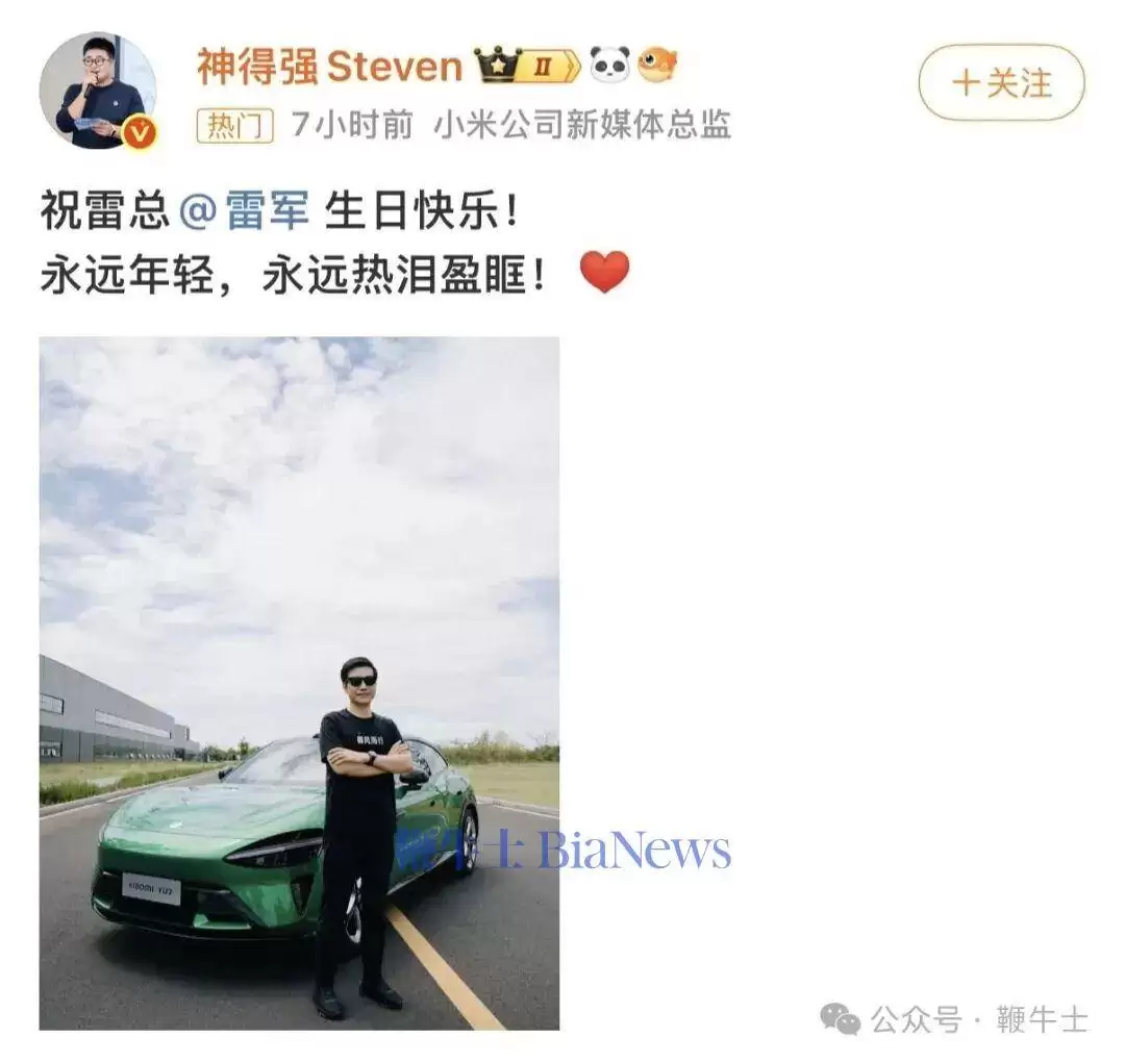 今天是小雷总的生日。雷军,小米集团的创始人,迎来了他个人又一年成长的纪念。不仅公司内部洋溢着庆祝的氛围,广大的“米粉”社群也纷纷行动起来,用各种创意方式为他送上真挚的祝福。小米公司新媒体总监理所当然地率先在社交平台发声,她发布的图文动态写道:“祝雷总生日快乐,永远年轻,永远热泪盈眶!”并附上了一张雷军站在小米SU7旁的合影。这条动态迅速引发了广泛共鸣和关注。