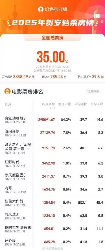 根据灯塔专业版数据,截至12月13日13时50分,2025年贺岁档(11月28日至12月31日)总票房(含预售)已突破35亿元大关。