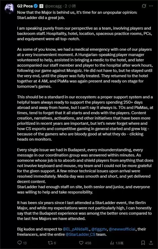 随着StarLadder布达佩斯Major的落幕,各方复盘与评价纷至沓来。在一波常见的赛后讨论中,G2战队经理Peca在社交平台发布了一条推文,他结合团队的亲身经历,不仅高度赞扬了赛事主办方StarLadder的组织工作,更洋洋洒洒地表达了对整个电竞赛事生态重心的思考。