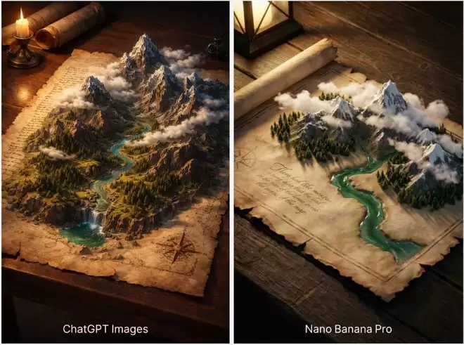 描述:一幅超逼真的 3D 等距视角杰作,描绘了一幅展开在光滑深色木桌上的魔法地图。地图绘制在一张古老而饱经风霜的羊皮纸卷轴上,但画面中的景色以立体模型的形式跃然纸上。巍峨的岩石山脉,白雪皑皑的山峰,穿透缕缕白云;一条蜿蜒的碧绿河流从中心流过;山麓覆盖着茂密葱郁的松林。羊皮纸边缘呈锯齿状,左侧饰有精美的复古书法,角落则绘有罗盘玫瑰图案。画面采用温暖的电影级光照,焦点清晰,纹理细节丰富,2K 分辨率,以奇幻冒险为主题。