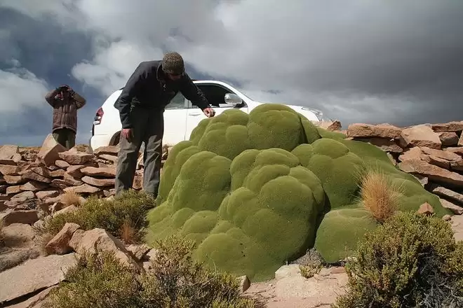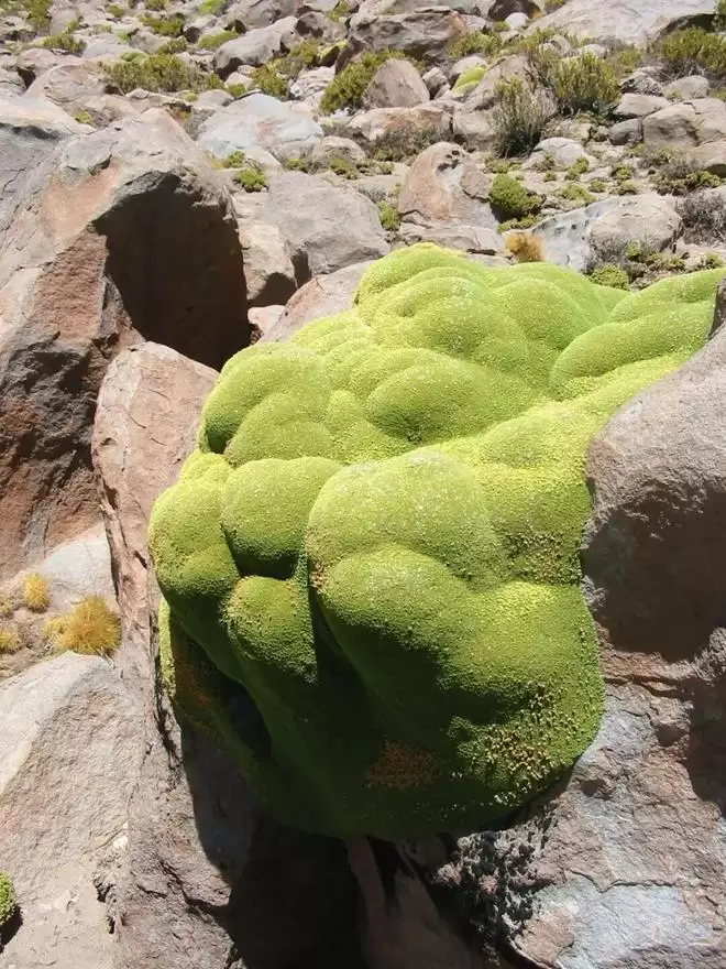 虽然 Azorella compacta 看起来像是一团附着在岩石上的巨大绿色苔藓,甚至像是一块发霉的巨石,但它实际上是伞形科(Apiaceae)的植物。
