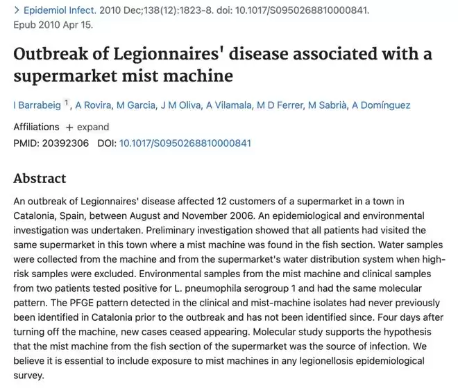 如果只是难闻,那顶多算是一次糟糕的消费体验。但当水变成了气溶胶,事情的性质就变了。2006年,加泰罗尼亚一家超市的蔬菜保鲜喷雾系统因为长期未彻底清洗,导致嗜肺军团菌(Legionella pneumophila)在管道内大量繁殖,最终喷出的带菌水雾导致12名顾客感染了严重的肺炎 。