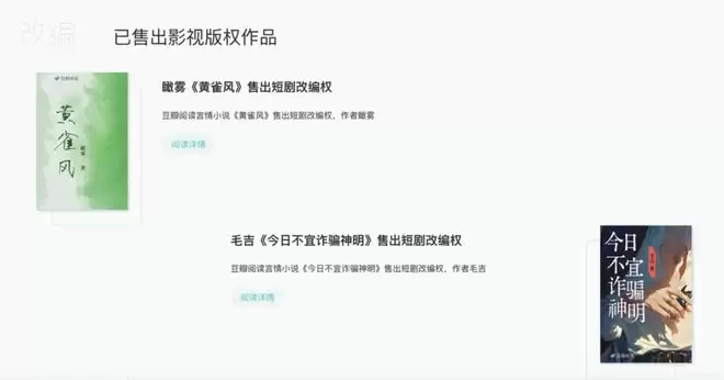 此外,一些相对原本更面向传统影视、更偏品质阅读调性的阅读平台也被考虑进来。豆瓣阅读的影视改编页面售出短剧版权,例如11月就有言情小说《黄雀风》、《今日不宜诈骗神明》售出短剧改编权。从剧情简介来看,这两部小说都是有强戏剧线的都市言情故事,包括豪门修罗场、破镜重圆等。