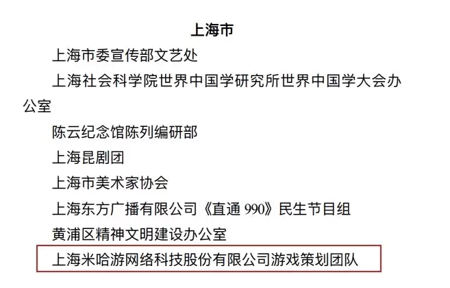 有用户发现,在上海市公示的名单中,出现了米哈游网络科技股份有限公司游戏策划团队的身影。此外,一同上榜的还有湖南快乐阳光互动娱乐传媒有限公司(芒果TV)、奥飞娱乐股份有限公司、成都可可豆动画影视有限公司等商业机构。