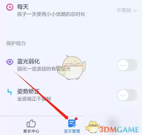 1、打开小小优酷,进入家长设置页面,点击“宝贝管理”选项。
