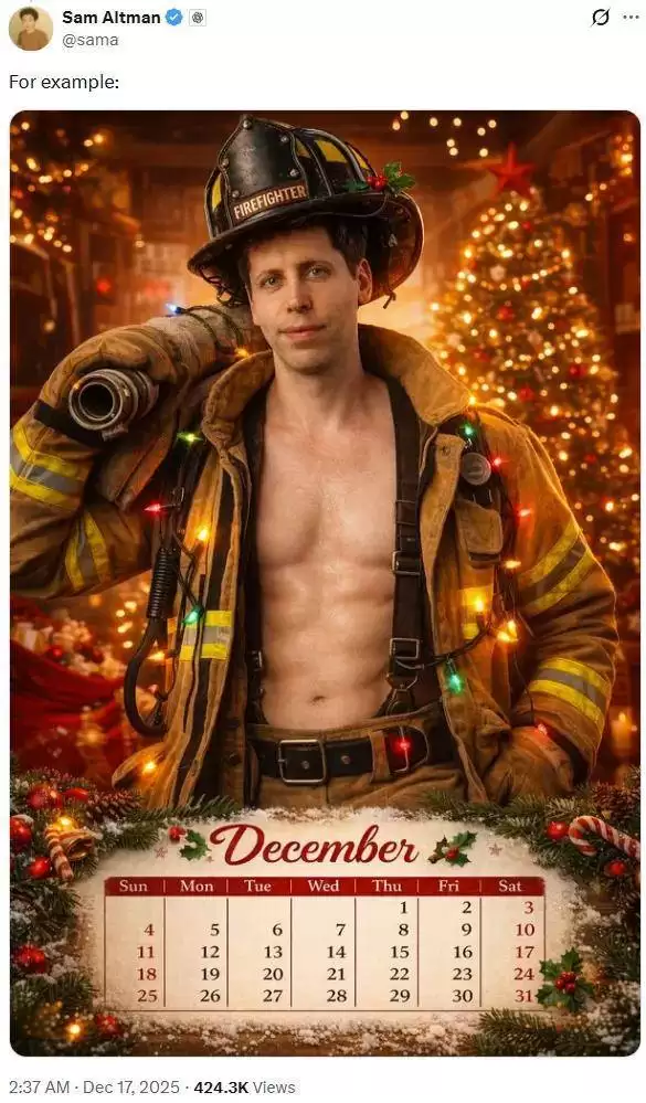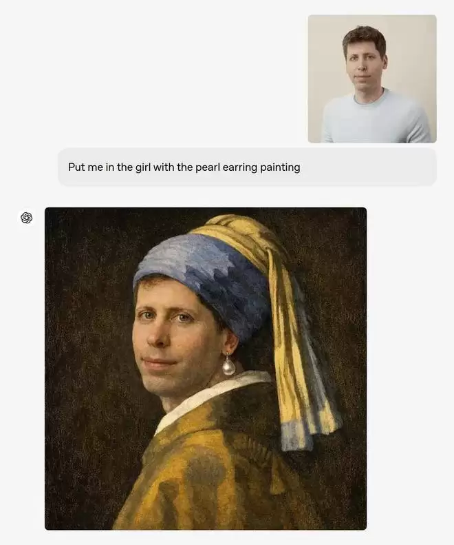 实际上,山姆・奥特曼之所以发这样一张辣眼睛的图片,正是为 OpenAI 刚刚推出的全新ChatGPT Images造势。而且这也不是唯一一张基于奥特曼照片改的图。OpenAI 最新号还专门单独特地发了一张这样的: