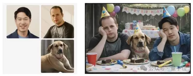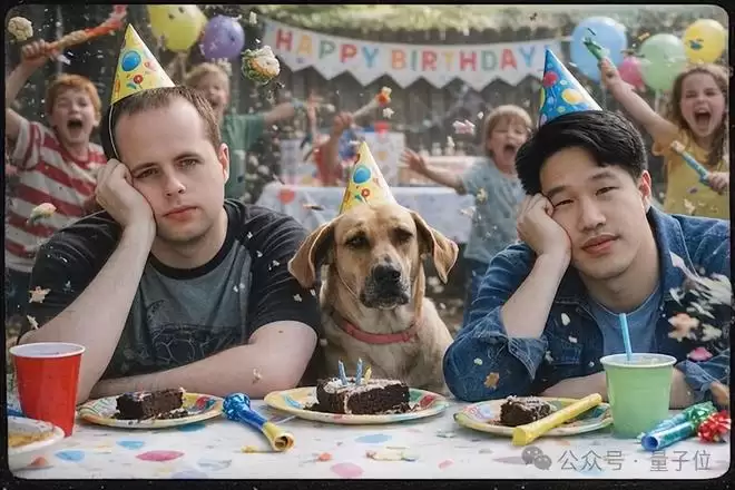 例如:生成一张2000年代胶片相机风格的照片,画面中两名男子和一条狗出现在孩子的生日派对上,神情略显无聊。
