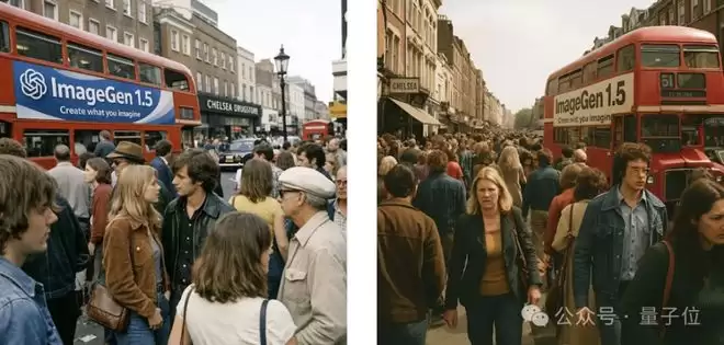 拍摄一张20世纪70年代伦敦切尔西的场景照片,画面要逼真,所有景物清晰对焦,人群密集,还有一辆公交车,车身贴着「ImageGen 1.5」的广告,广告上印有OpenAI标志和「创造你的想象」的副标题。整体风格像业余摄影作品,iPhone快照画质……