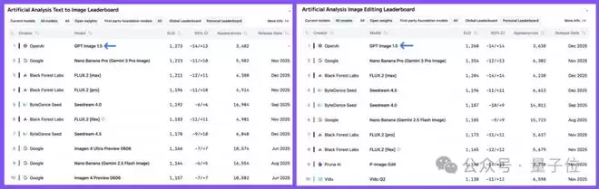 评测机构Artificial Analysis指出,GPT-Image-1.5在文本转图像图像编辑方面中均位列第一,超过Nano Banana Pro。