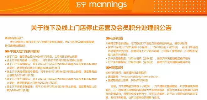 公告指出,万宁线下门店的最后营业日定在2026年1月15日,之后将正式停止运营。此外,其线上“万宁最新商城”小程序将于2025年12月28日24时停止服务,而天猫旗舰店、京东旗舰店、天猫保健品行营店则将在今年12月26日停运。
