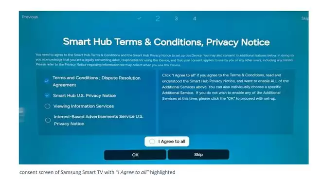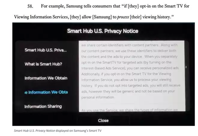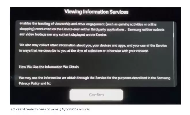 起诉书指出,这五大制造商为获取数据,设计了极具欺骗性的用户界面。以三星为例,诉讼指出其开机设置中引导用户开启ACR。