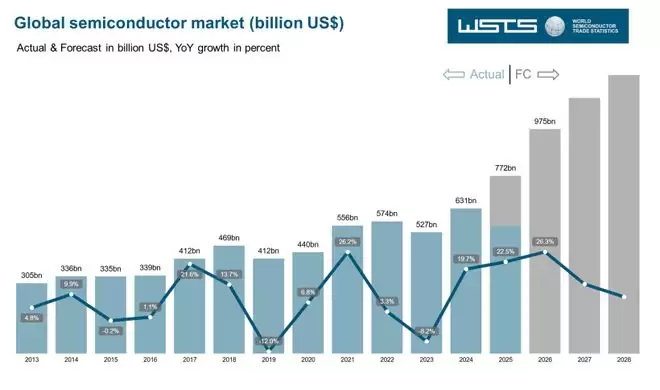 WSTS预计继2024年强劲反弹之后,2025年全球半导体市场将增长22.5%,总价值将达到7722亿美元,高于WSTS春季给出的展望;2026年半导体市场总价值则有望在2025年的强劲增长基础之上大举扩张至9755亿美元,接近SEMI预测的2030年1万亿美金的市场规模目标,意味着有望同比大增26%。