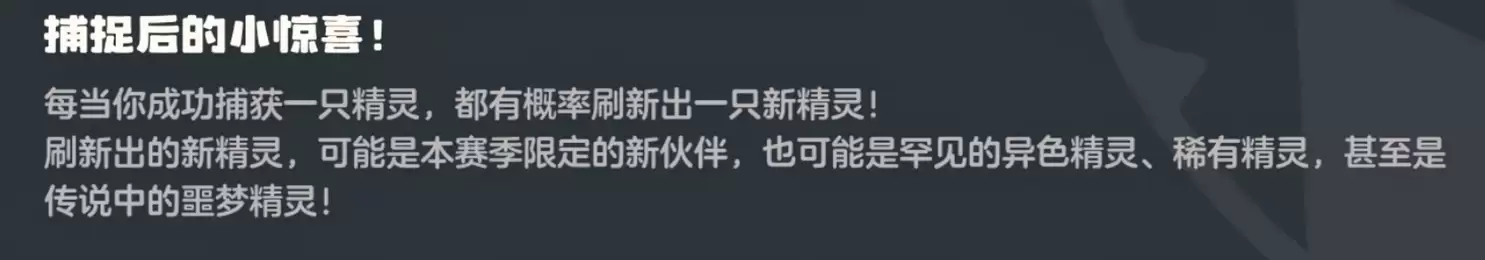 关于异色的刷新机制,很多玩家的理解其实是错的。大多数玩家以为,必须一直抓同一种精灵,才有可能刷出它的异色形态,事实完全不是这样。真实的情况是,你只要保持连续捕捉的动作就行了,抓什么精灵都可以。比如你想刷大耳帽兜的异色,在大茂州果实附近看到护主犬也好,蹦蹦花也罢,统统都可以抓。因为游戏的机制是每捕捉一只精灵,就会随机刷新出新的精灵,跟你抓的是哪一种并没有直接关系。
