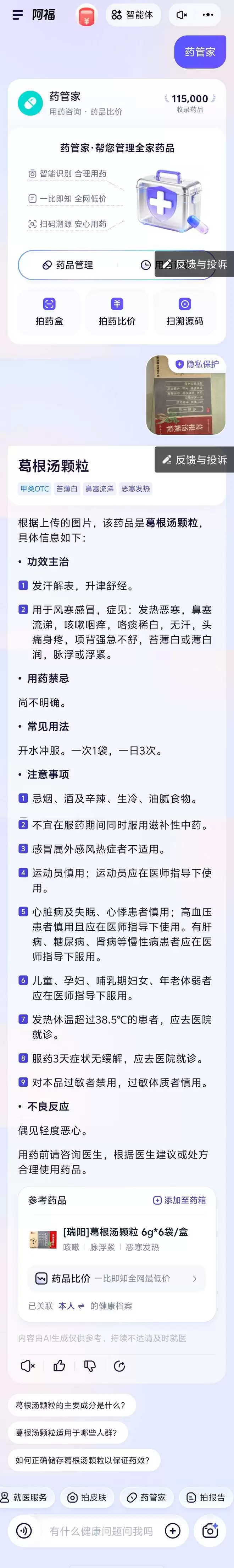 随手拍个药盒,阿福就能告诉你这药是干什么的,怎么吃,什么人不能吃,给出分量十足的用药提醒。