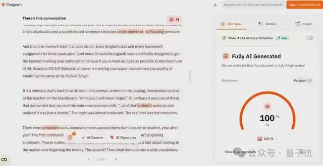 不过,令人啼笑皆非的是,小马的这篇感情饱满、“活人感”很强的文章,竟然还是被Pangram 判定为100%由AI生成。