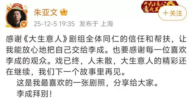 12月5日,他用一句“李成拜别”,为这个角色画上了一个圆满的句号。