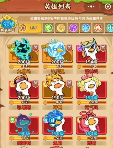 核心英雄:太阳鸟(直接伤害)、机器鹅(持续输出)、战鼓鸡(攻击增益)