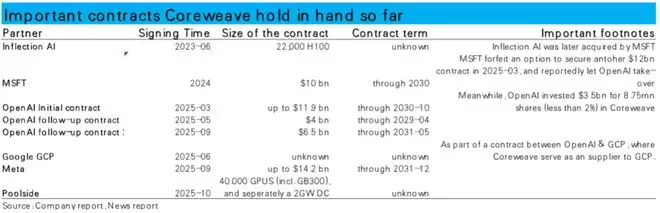 更“实时反映现状”的在手合约月同样呈现用户集中的现状:在3Q25披露的$556亿未履约合同余额中,来自OpenAI,微软和Meta这三家的合约金额就接近$470亿。