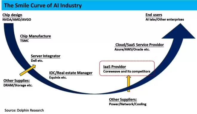 下图概括性的展示了整个云服务从上游到下游的产业链,如著名的“微笑曲线”,海豚君认为在算力产业链中的两端——更靠上游设计和更靠下游接触终端用户的部分是产业链中议价能力相对更强的。