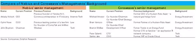 相比之下,据悉公司在新云领域内主要的竞争对手之一—Nebius则在软件/编程能力上更有优势。作为一个侧面的证据,从两家公司的创始人和核心管理层的不同背景,也能对两家公司不同的导向窥见一二。