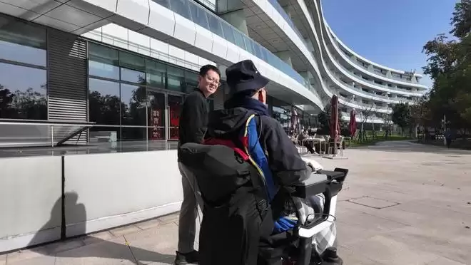 第二例侵入式脑机接口临床受试者(右)用意念控制轮椅,与赵郑拓研究员(左)一起遛弯