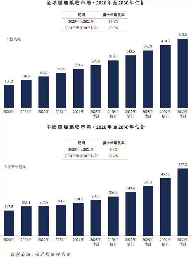 根据GLOBOCAN的数据,2024年全球癌症新发病例约2,000万,死亡病例约970万,预测到2030年全球癌症新发病例将接近2,400万,死亡病例将接近1,200万。从市场规模来看,全球肿瘤药物市场已从2020年的1,503亿美元增长到2024年的2,533亿美元,复合年增长率达13.9%,且预计还将以10.2%的复合年增长率增长至2030年的4,525亿美元,癌症诊疗药物市场空间巨大。