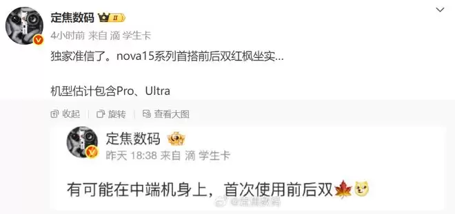 如果华为nova 15系列真的配备了前后双红枫镜头,这将是华为首次将这一旗舰级影像技术同时应用于手机的前后摄像头系统。