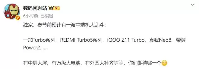 据博主爆料,一加、小米、iQOO、realme、荣耀五大品牌即将推出Turbo系列新机,涵盖一加Turbo 6系列、小米REDMI Turbo 5系列、iQOO Z11 Turbo、realme真我Neo8、荣耀Power 2等机型。
