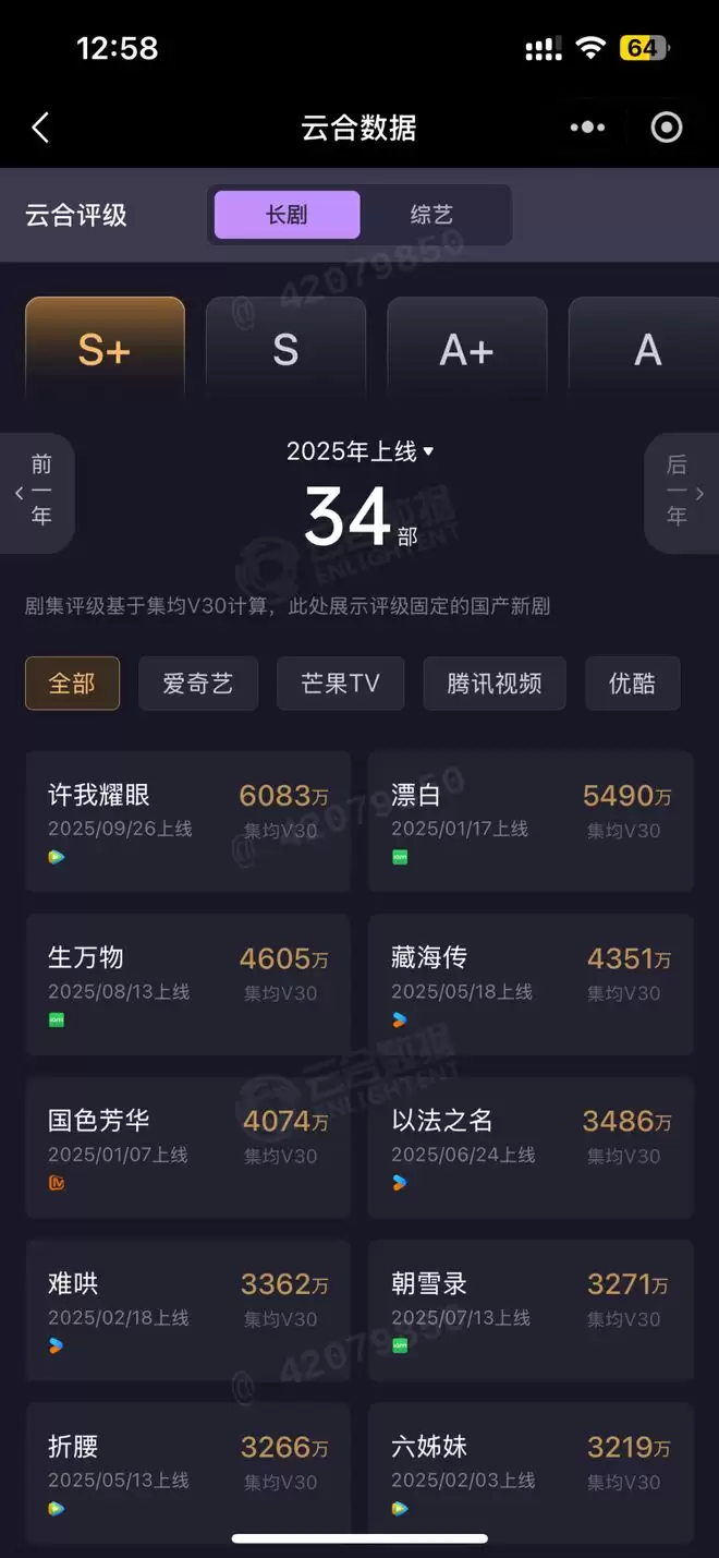 具体播出效果有待观望,不过今年现偶的爆款和黑马指标,已经超额完成了。截至目前,云合年榜TOP10中,现偶强势占据两席,《许我耀眼》更是以集均V30达到6083万而强势登顶,《难哄》也凭借3362万的成绩成为第七名。在S级评级剧中,《滤镜》也杀入了TOP10,与《长安的荔枝》《淮水竹亭》形成一争之力。