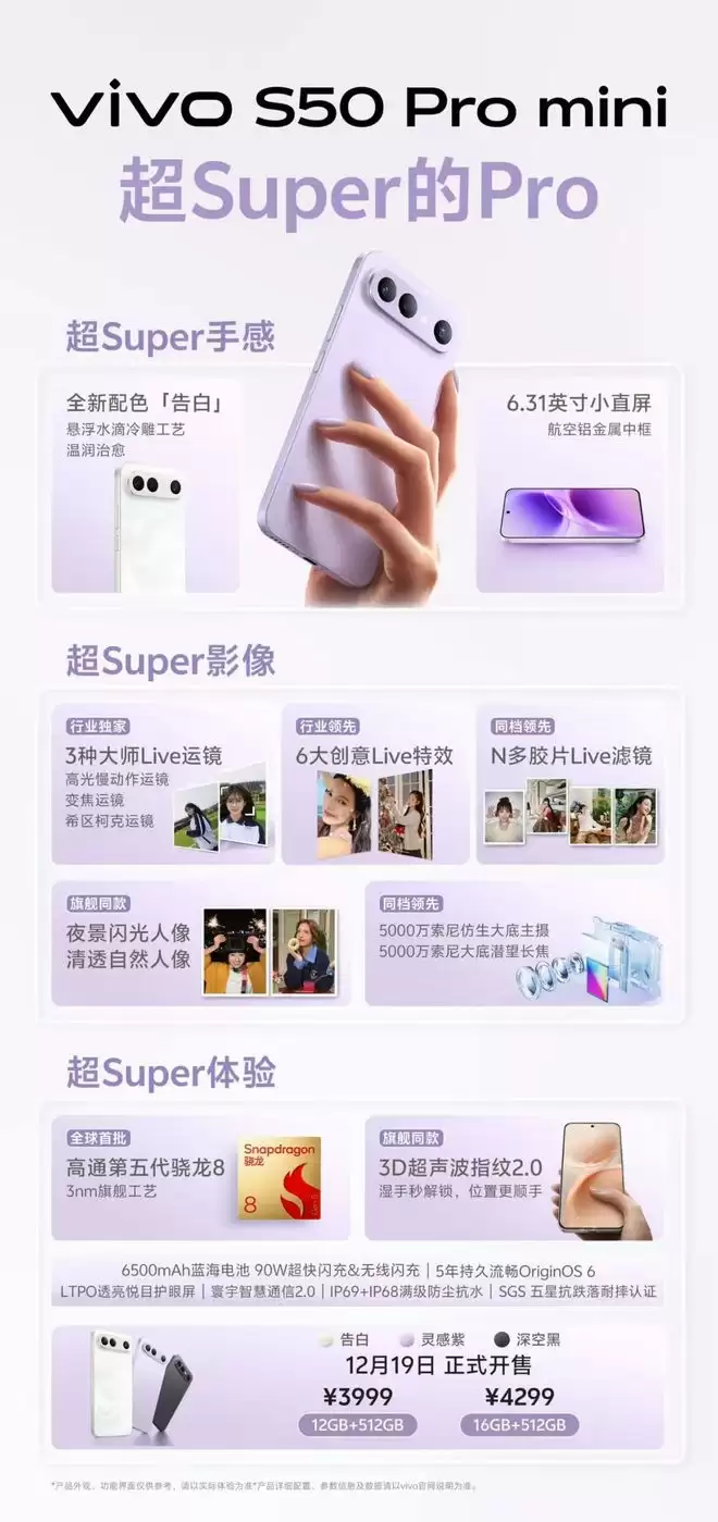 价格方面,vivo S50共提供4个版本可选,12GB+256GB版本售价2999元;12GB+512GB版本售价3299元;16GB+256GB版本售价3399元;16GB+512GB版本售价3599元。vivo S50 Pro mini则有3个版本可选,12GB+256GB版本售价3699元,12GB+512GB版本售价3999元,16GB+512GB版本售价4299元。