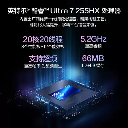 它搭载了英特尔酷睿Ultra 7 255HX处理器,拥有8个性能核心和12个能效核心,组成20核20线程的强劲配置。最高睿频可达5.2GHz,L2+L3缓存总计达66MB,无论是游戏还是内容创作,都能提供出色的计算性能。