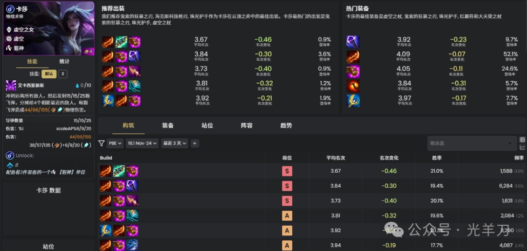在当前版本中,鬼索的狂暴之刃、海克斯科技枪刃以及珠光护手是卡莎最为理想的核心三件套。卡莎最热门、强度最高的出装组合,通常围绕鬼索的狂暴之刃、珠光护手和虚空之杖来构建。