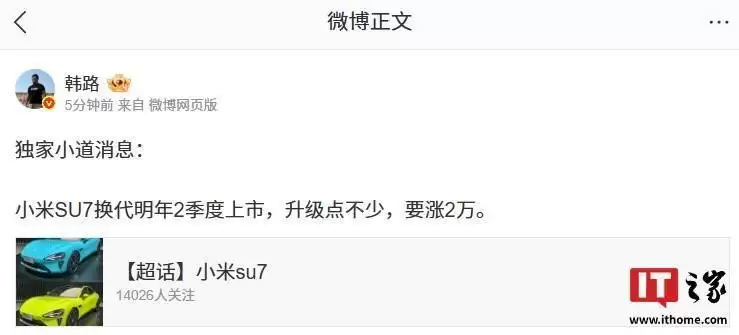 博主透露小米SU7换代车型明年Q2登场,配置升级或涨价2万