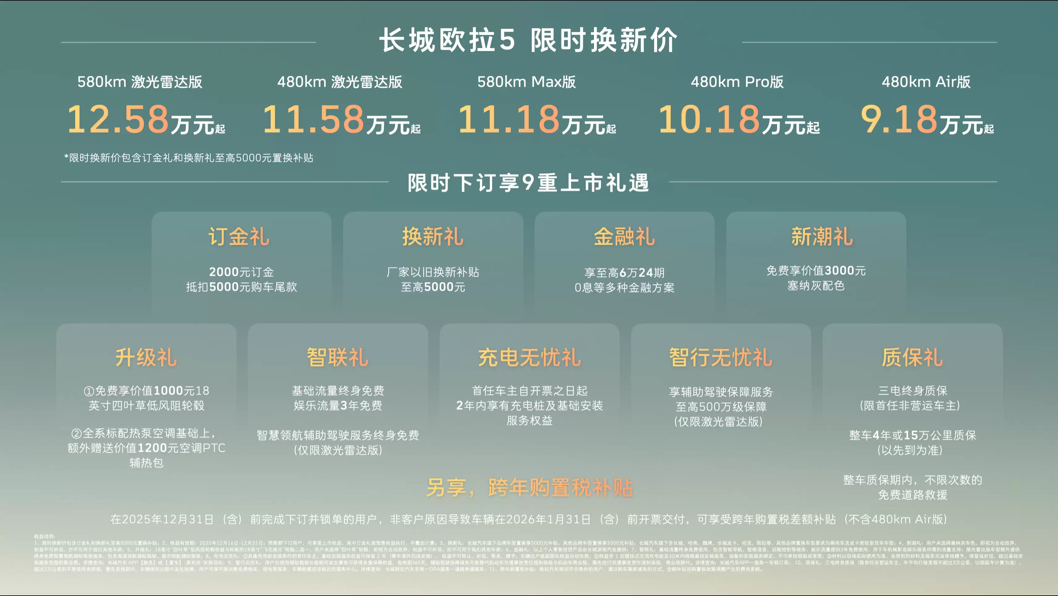 长城欧拉5此次共推出5款配置车型,建议零售价区间为9.98万至13.38万元。为回馈用户,品牌还推出限时换新价,9.18万元起即可入手(限时换新价包含“订金礼”和“换新礼”至高5000元以旧换新补贴)。不仅如此,即日起至2025年12月31日,下订并锁单的用户可尊享包含订金礼、换新礼、智行无忧礼在内的9重上市好礼,还有跨年购置税补贴(不含480km Air版)等丰厚权益,诚意满满。