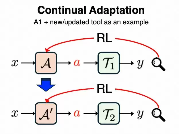 在协同适配框架下,智能体的决策与工具的内部机制同步调整,彼此构成动态的学习环境,从而形成更紧密、也更灵活的协作关系。这一设想突破了当前通过固定其中一方来维持训练稳定性的主流做法,使系统优化目标从单点性能提升转向整体协同效果。