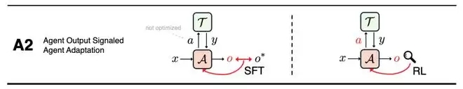 A2 同样以智能体的更新为目标,但其学习信号来自对智能体自身输出结果的评估。在该策略中,智能体的最终答案、规划方案或推理过程会被整体评判,其评价标准可以是答案是否正确、人类或模型给出的偏好评分,或对推理质量的综合判断。