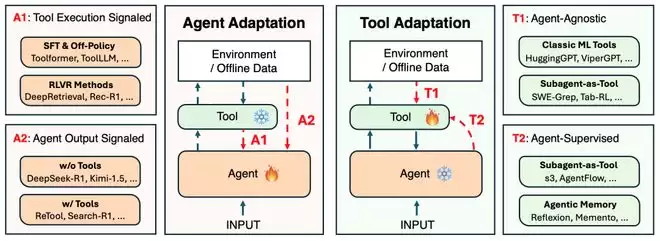 当前的一个热门研究方向是:Agentic AI 系统通过适配(adaptation)机制对自身进行调整,从而提升其自身性能、可靠性和泛化能力,从而更好地适应特定任务需求和现实世界环境。