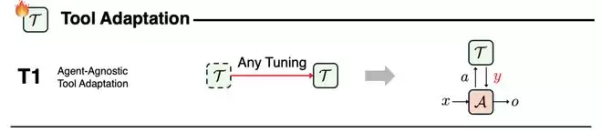 在 T2 中,智能体依然保持固定,但工具会根据智能体的输出表现或使用效果进行更新。例如,检索器可以依据智能体最终任务是否成功来调整检索策略,重排序模块可以学习为智能体提供更有用的信息排序,记忆模块也可以根据智能体的使用习惯不断优化存储内容。