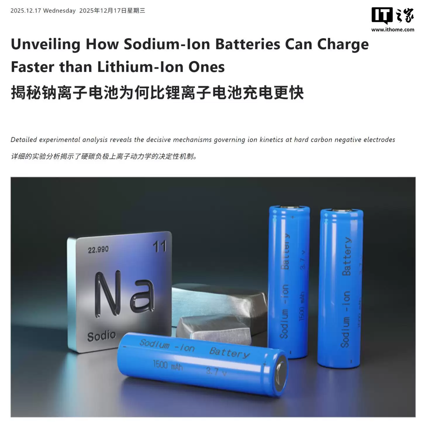 12月18日消息,东京理科大学(TUS)于昨日(12月17日)发布研究论文,宣布其科研团队证实,钠离子电池(SIBs)在使用硬碳负极时,其充电速度在本质上可以超越锂电池(LIBs),有望成为智能手机电源的下一代解决方案。