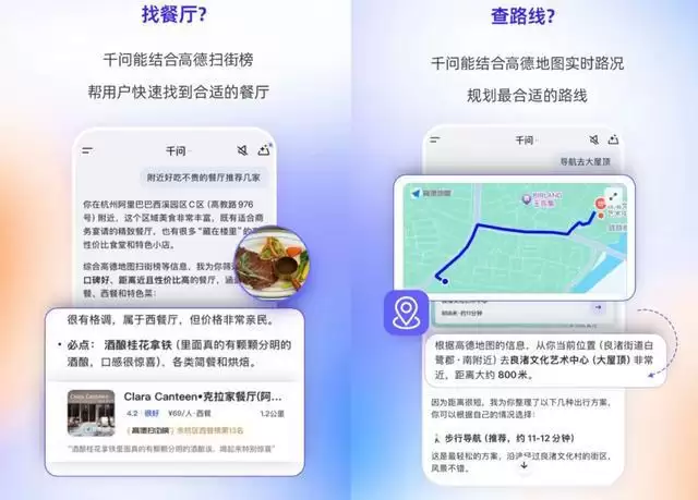 在最新版本中,这种能力已初步显现。千问APP不再只是生成一段文字建议,而是能够调用高德地图、扫街榜等底层服务,即时生成包含推荐餐厅、酒店、地理位置及出行方案的可视化决策卡片。用户点击卡片,即可唤起导航或打车。