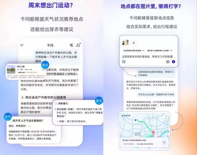 千问的视觉理解能力也在地理场景中得到了延伸。用户收到婚礼请柬,只需截图上传并问一句:“周日要去这里参加婚礼,帮我推荐这附近的酒店”,千问即可精准提取图片中的地址信息并生成住宿建议。同时,千问还能根据天气状况推荐地点,还能给出穿衣建议。
