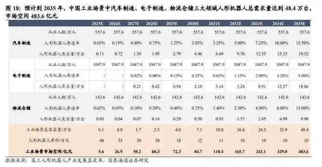 基于此,国泰海通证券对市场空间做出了量化预测:“预计到2035年,中国工业场景中汽车制造、电子制造、物流仓储三大领域人形机器人总需求量达到48.4万台,市场空间483.6亿元”。这一预测为投资者描绘了巨大的增长潜力。