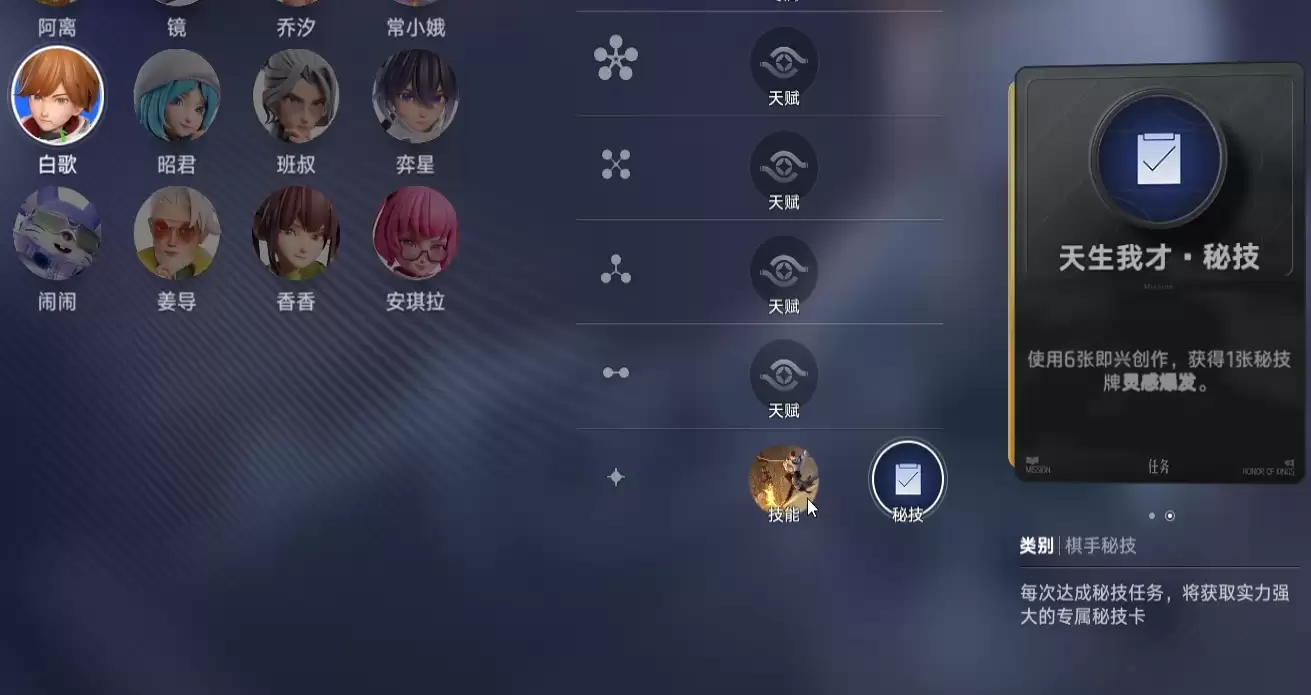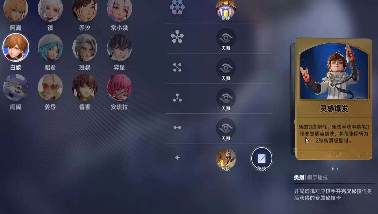 在王者万象棋中,灵感爆发机制打破了传统自走棋依赖搜牌“凑羁绊”和“合三星”的定式。它以棋手技能的成长为基础,构筑起高层次的对战能力。目前,这一秘技牌主要与棋手白歌绑定。白歌的被动设定为:每完成一定次数的英雄合成操作,便可获得一张名为“即兴创作”的效果卡。这张卡牌使用后可以随机复刻一张当前场上已经上阵的英雄。当玩家累计获得足够数量的“即兴创作”卡牌后,系统便会自动解锁“灵感爆发”秘技牌。这种解锁方式,要求玩家在对局前期的英雄合成过程中,保持稳定且连贯的操作节奏。