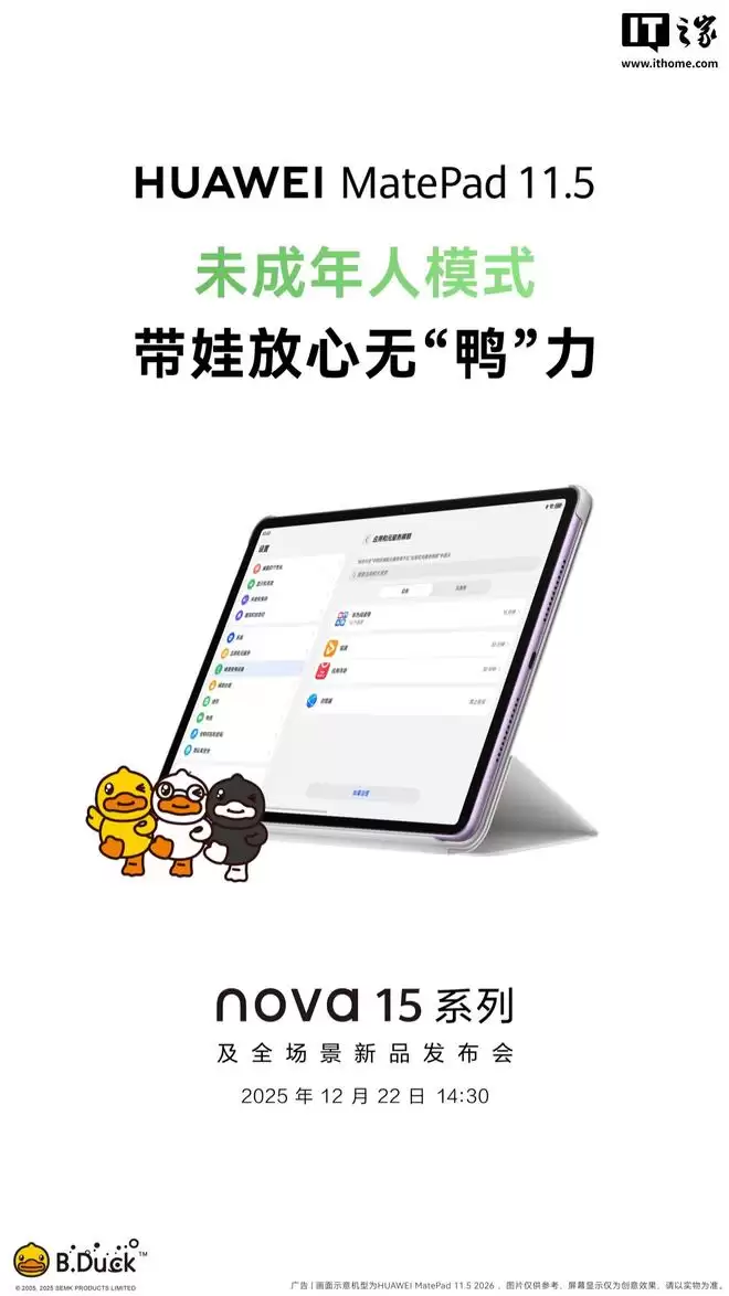 最新的预热海报显示,华为新一代MatePad 11.5将支持类自然光显示、华为笔记App、小艺深度解题、未成年人模式等功能。此外,华为预热海报中还出现了B.Duck小黄鸭形象,预计本次MatePad 11.5还将与小黄鸭展开联动。