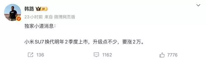 12 月 17 日,知名汽车博主韩路爆料,小米 SU7 换代车型将于 2026 年二季度上市。新车不仅配置大幅升级,售价预计也将上调约 2 万元。