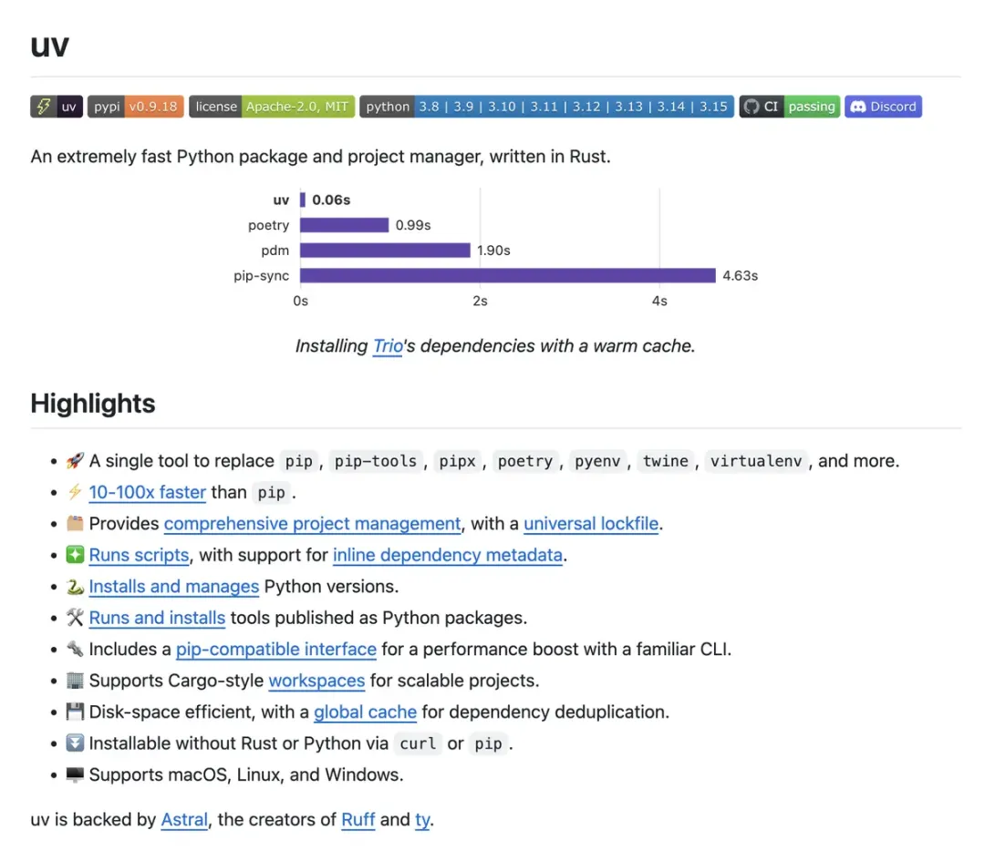 简单来说,uv 是一个速度飞快的 Python 包安装器和解析器。它最大的卖点就刻在它的基因里:它是用 Rust 语言编写的。